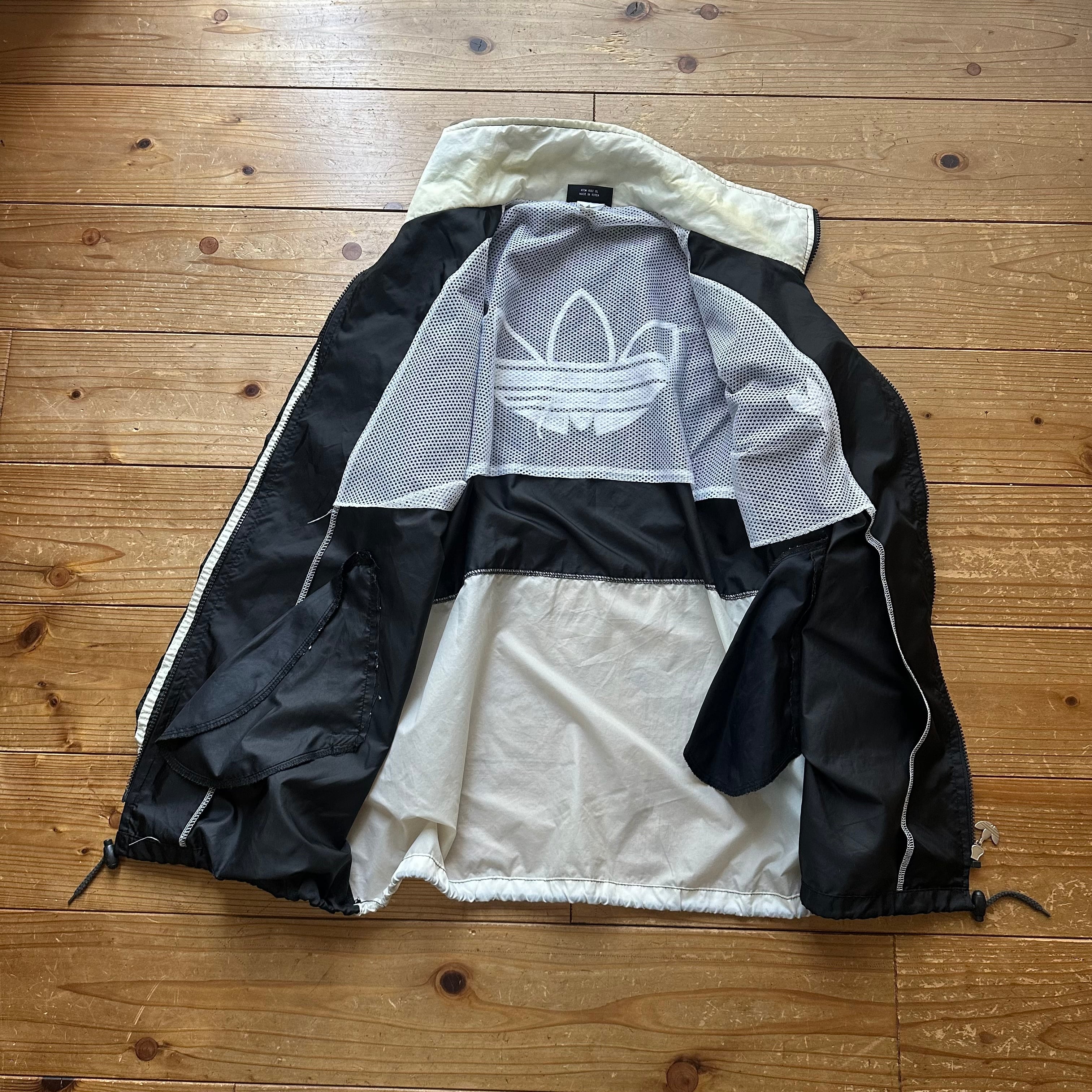バックのトレフォイル刺繍がオールドスクールな雰囲気のブラックホワイト切り替えの2トーントラックジャケット。