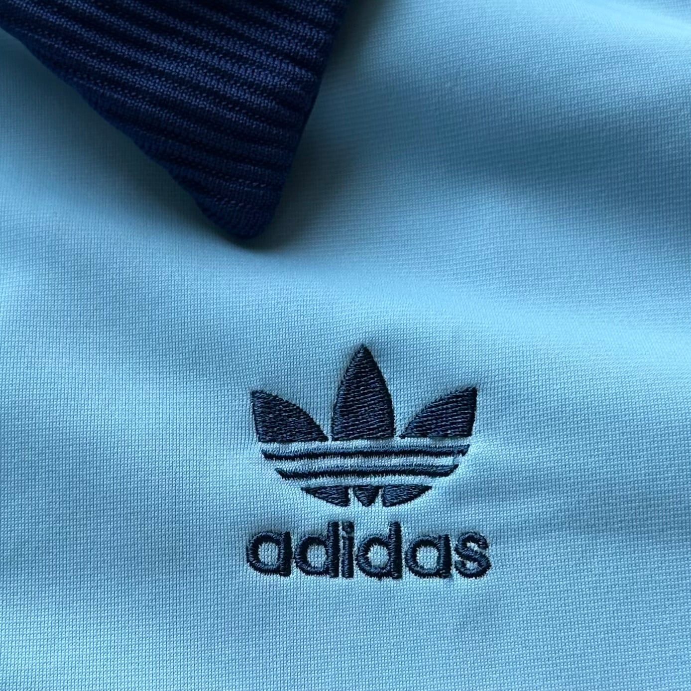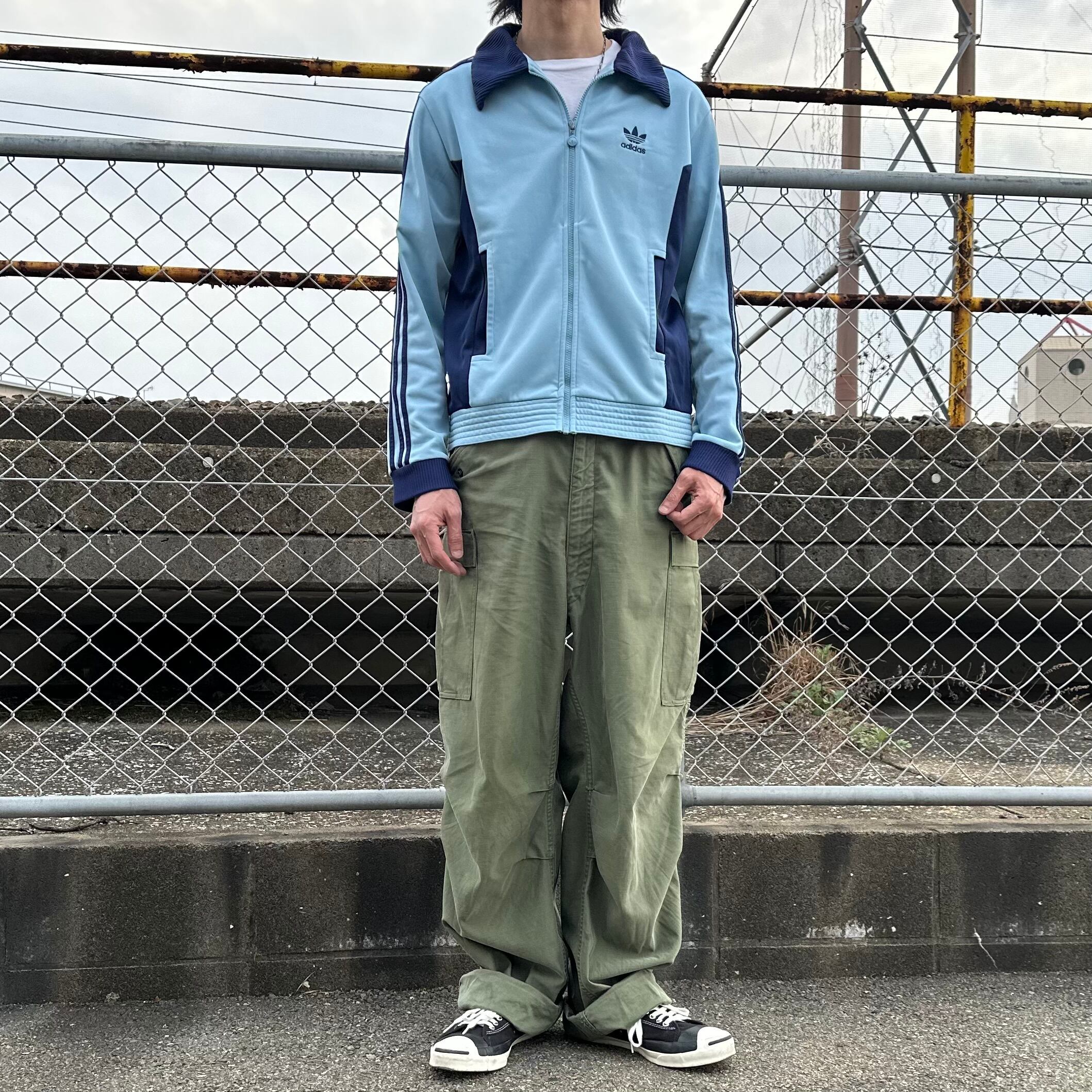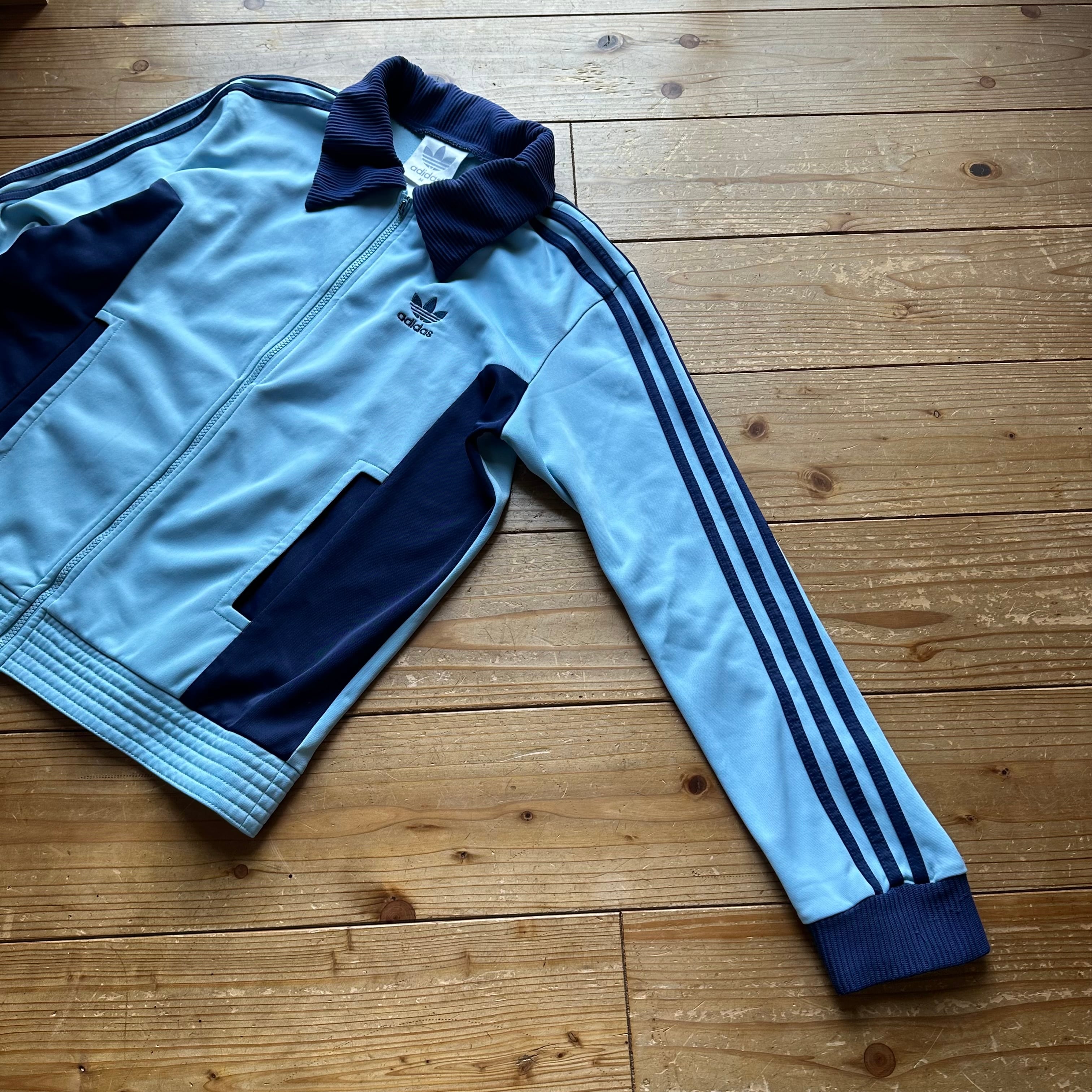 90s 銀タグ 万国旗タグ old adidas オールドアディダス 70s VENTEX フランス製 復刻 2トーン 切り替え トレフォイル 刺繍 トラックジャケット ジャージ サックス ブルー M