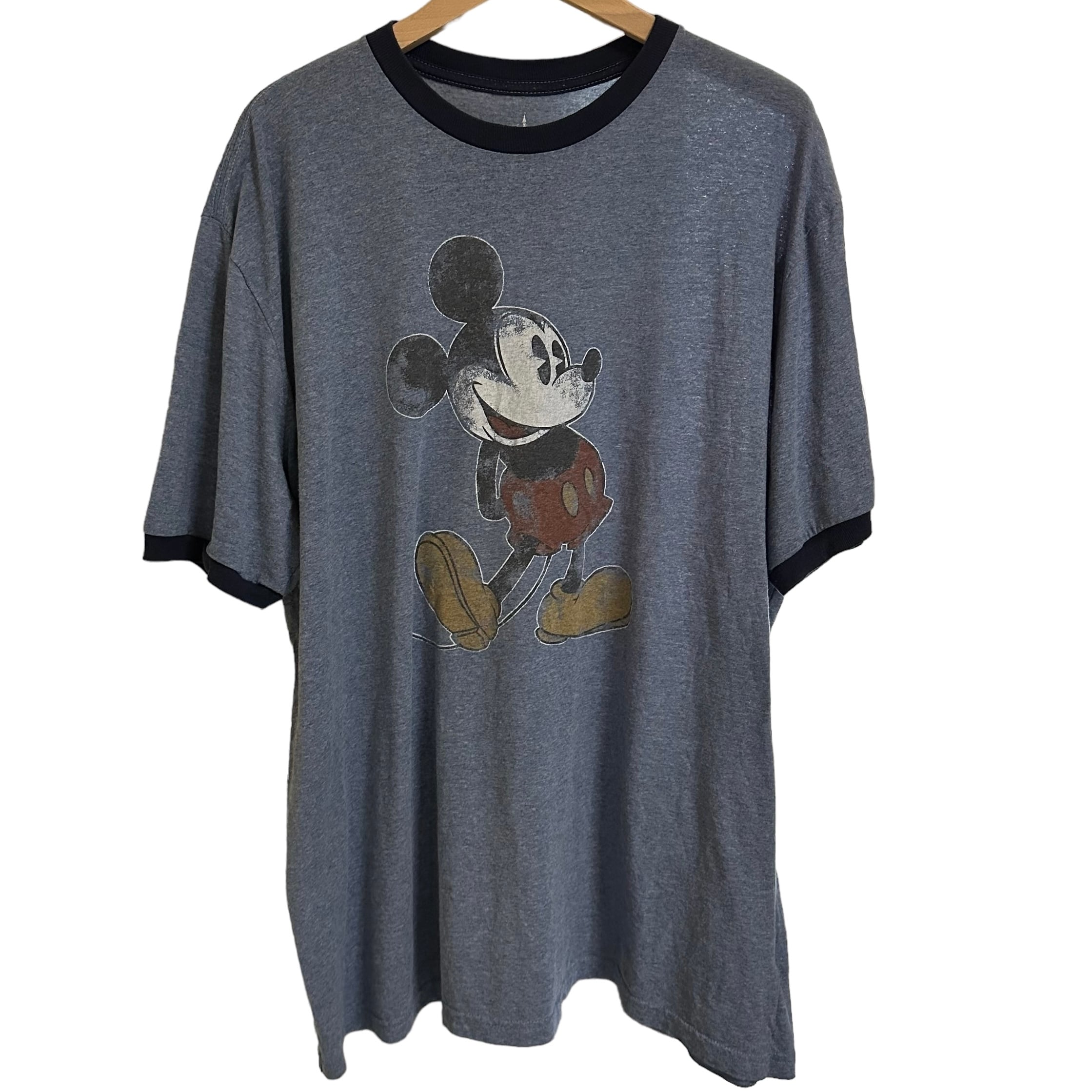 USED ディズニー ミッキー ビッグサイズ グッドフェード リンガーTシャツ ブルー XL