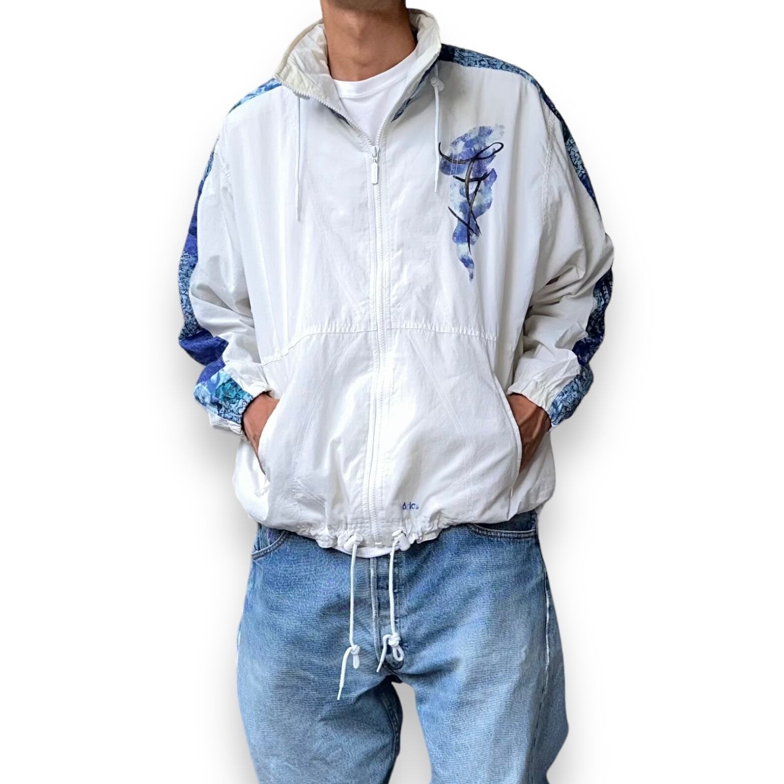 ホワイトボディにブルーのプリントが入った珍しいデザインのトラックジャケット。