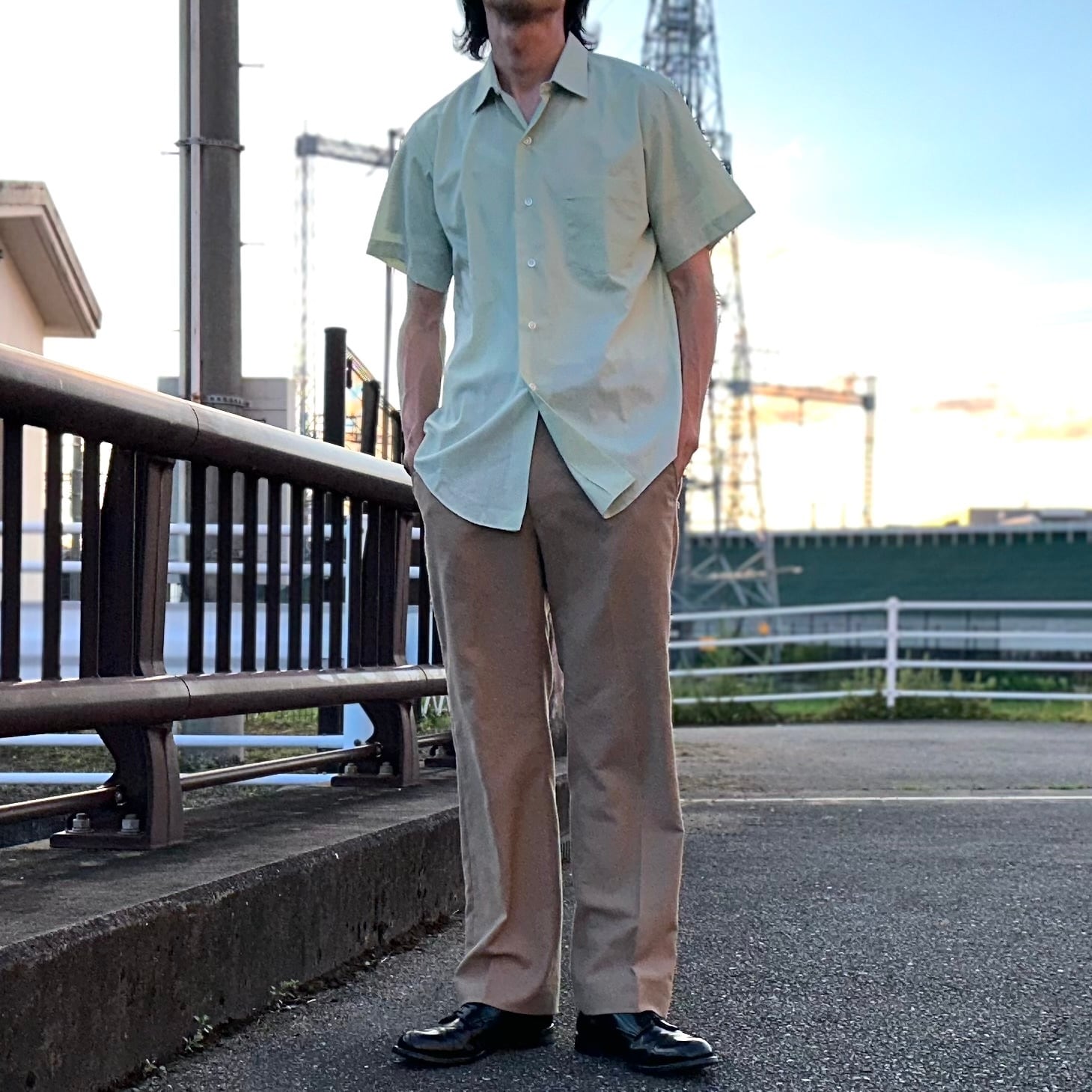 60s~70s VINTAGE イギリス領香港 ブリティッシュホンコン製 SANFORIZED PERMANENT PRESS コットンポリエステル 半袖シャツ グリーン L